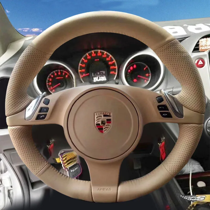 For Porsche Cayenne Panamera 2010-2012 Hand-Stitched Beige genuine Leather Non-Slip car Steering Wheel Cover
